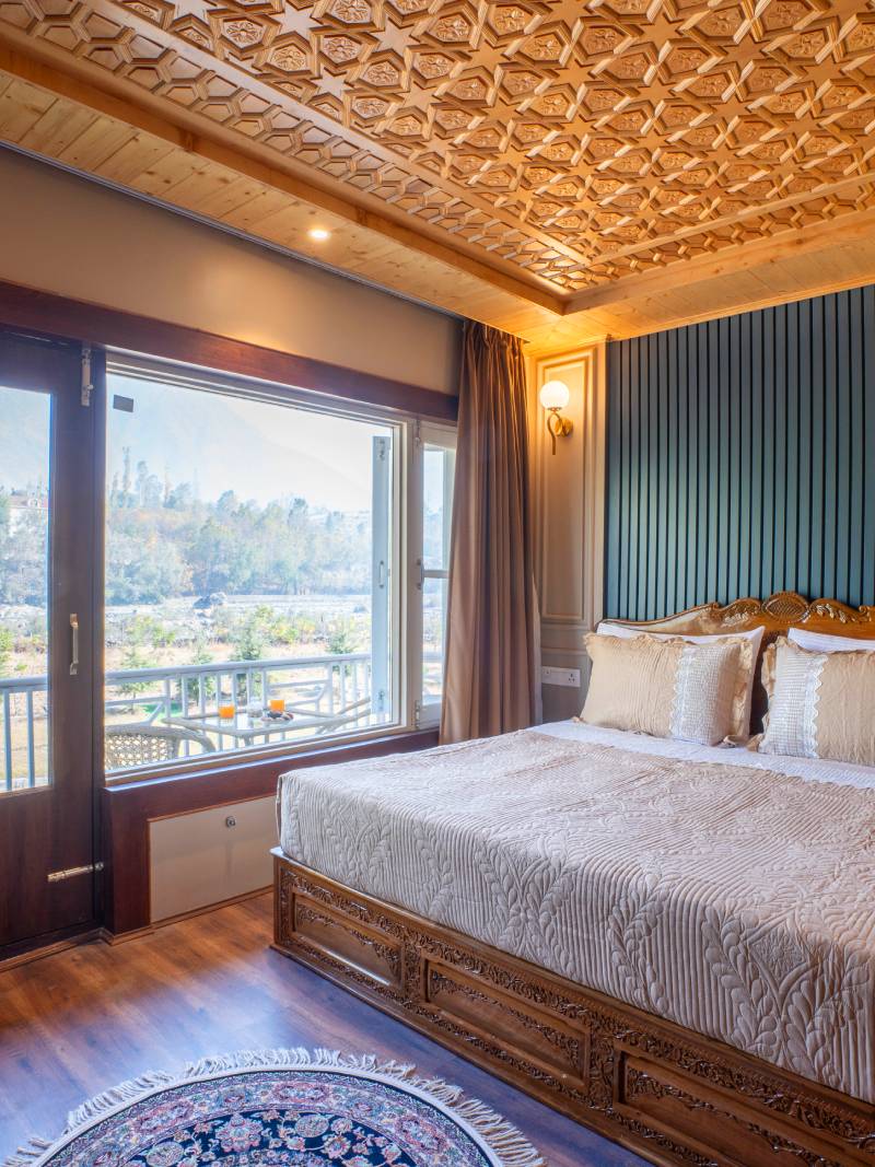 The Super Deluxe Rooms at Khwab Villa offer a perfect blend of elegance and comfort. Featuring plush king-size beds, air conditioning, Wi-Fi, TV, and a private balcony with stunning mountain views, these rooms provide a relaxing retreat.