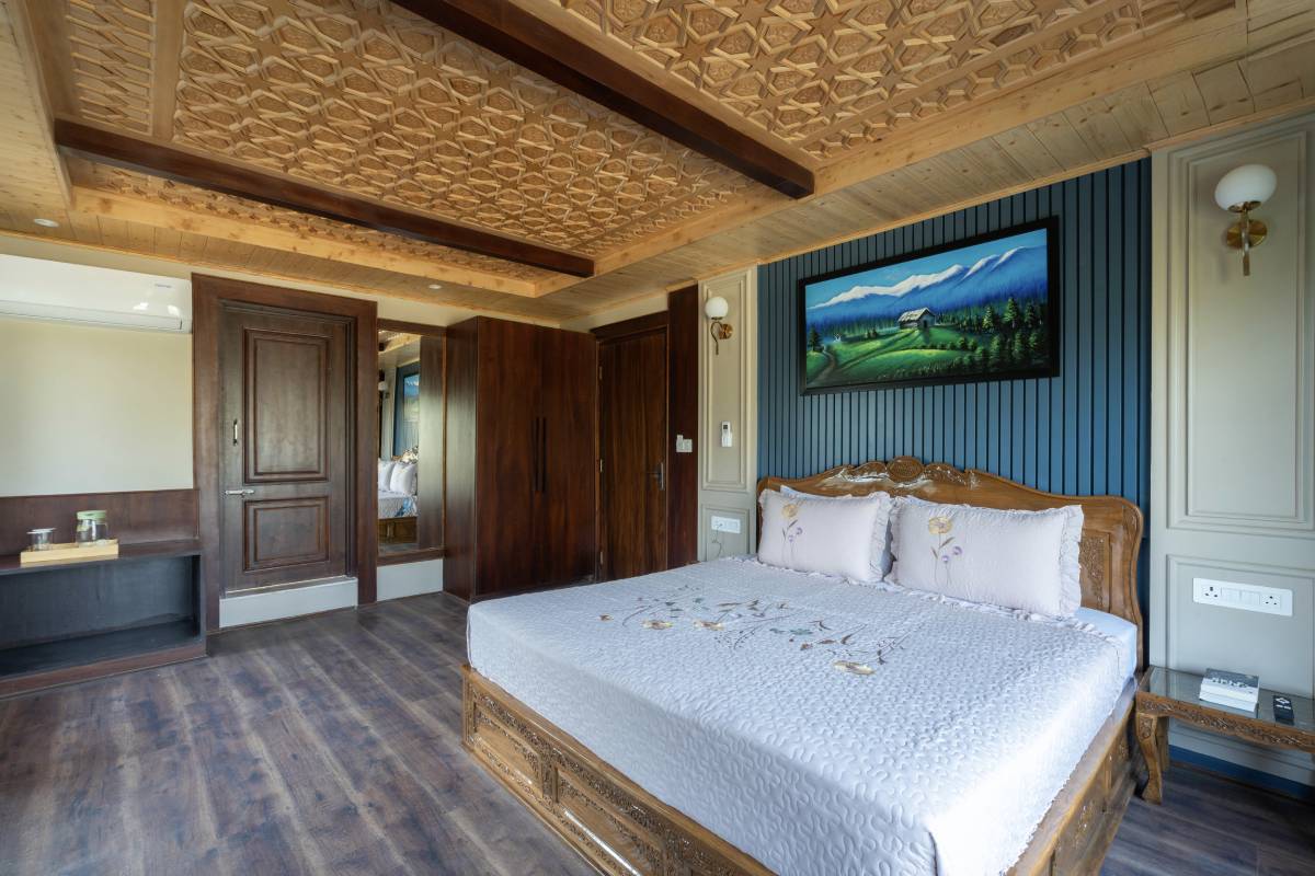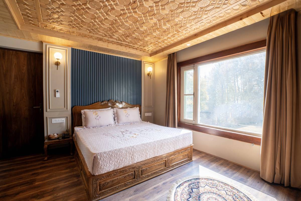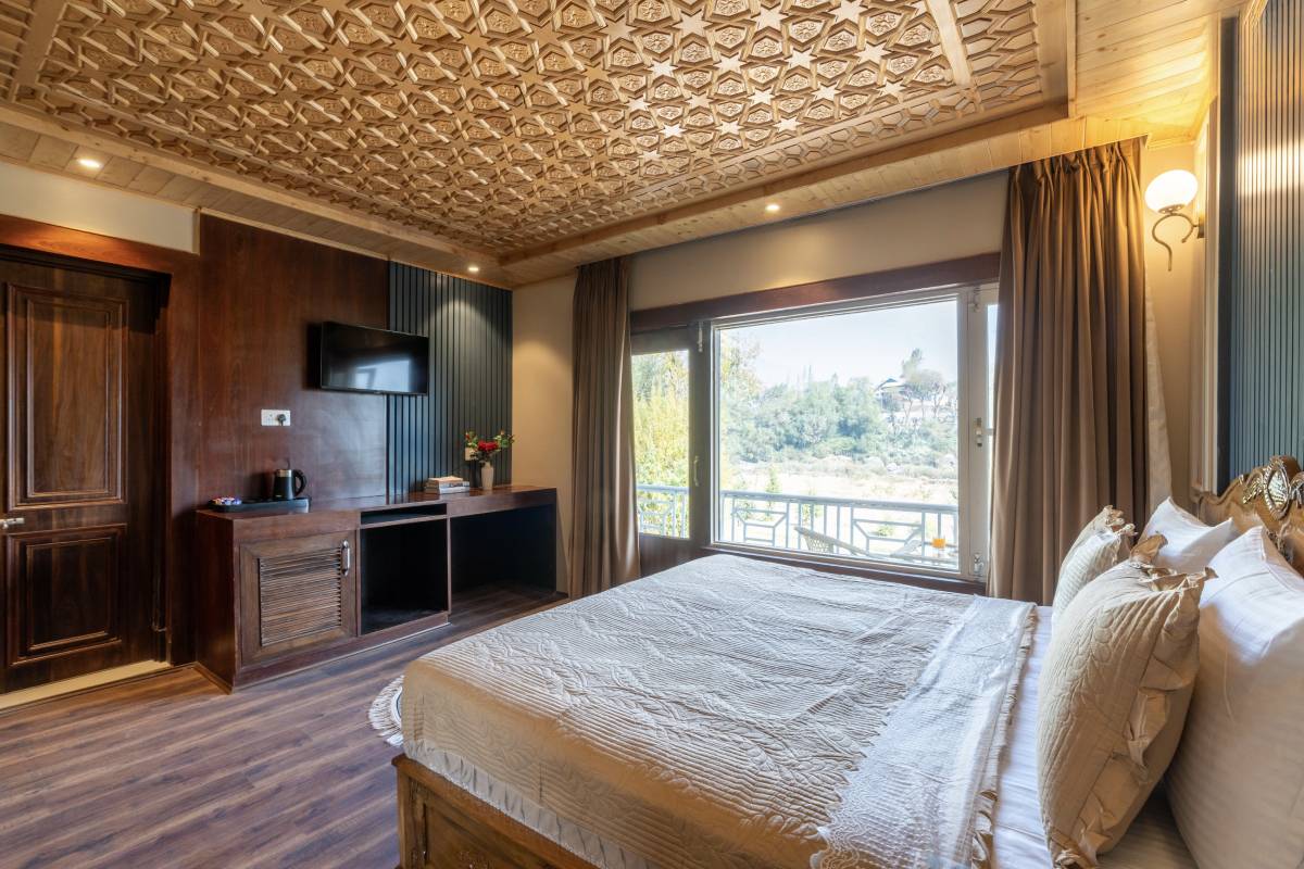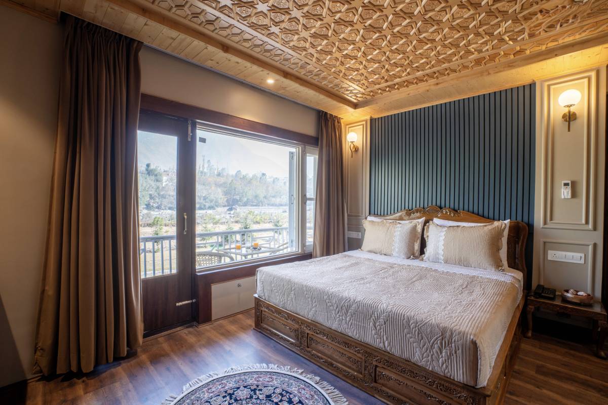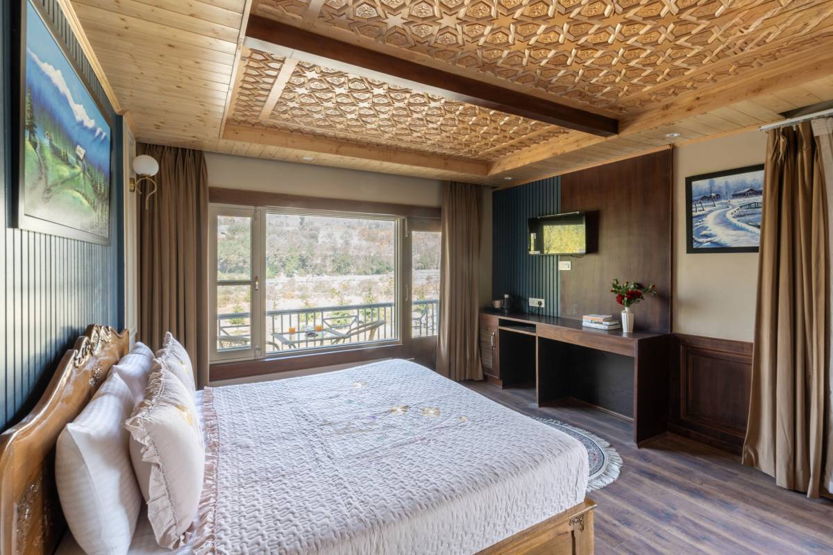 The Super Deluxe Rooms at Khwab Villa offer a perfect blend of elegance and comfort. Featuring plush king-size beds, air conditioning, Wi-Fi, TV, and a private balcony with stunning mountain views, these rooms provide a relaxing retreat. Guests can enjoy modern amenities like a workstation, wardrobe, geyser, toiletries, and a cozy seating area, ensuring a luxurious and peaceful stay in the heart of Ganderbal’s natural beauty.